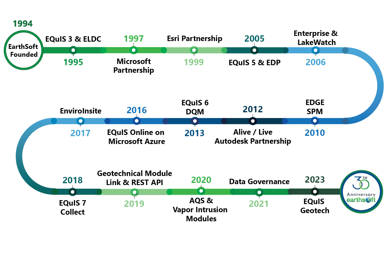 “EarthSoft has focused exclusively on environmental data management innovation for 30 years! While this anniversary is a tremendous accomplishment, EarthSoft has broadened the EQuIS product line and continues developing new data management solutions in response to our clients’ growing and evolving data requirements.”