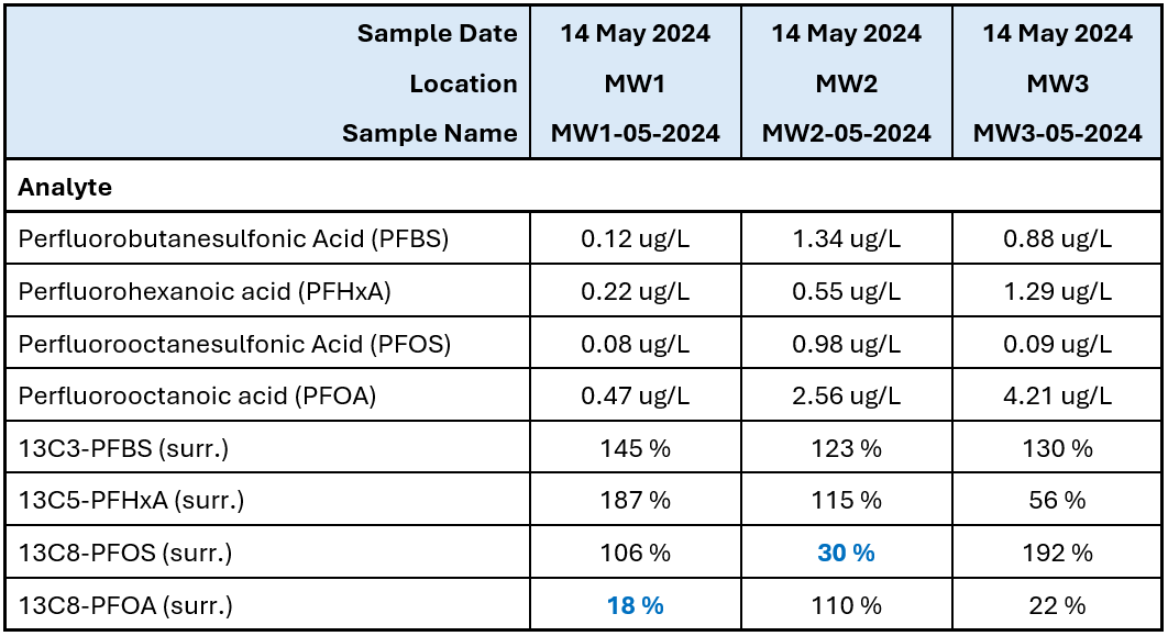 The EIS recoveries ideally would all be near 100% and determine that the PFAS methodology was fit for purpose for the samples analysed. In reality, there are matrix affects, pH changes, differing moisture content – all which can affect these recoveries and why USEPA Method 1633A has recovery limits typically in the range of 40-130%. However, some are as low as 5%, and some as high as 365%, depending on matrix. Table 6 and 8 of the USEPA 1633A method detail the acceptance criteria.
