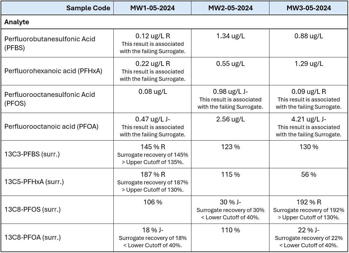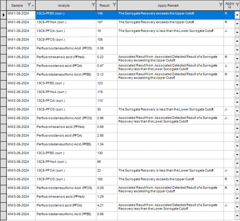 We have a result of 0.98 for PFOS and a remark that the result is affected by a low surrogate cutoff; in other words, the recovery for the surrogate was below our set limit. This aligns with the flagged recovery of the PFOS EIS at 30%. We set DQM to insert a qualifier code of “J-” next to any such result.