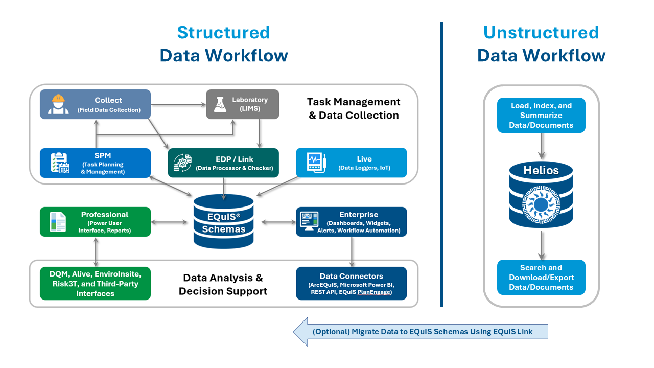EQuIS Helios is the newest addition to the EQuIS ecosystem. It offers a comprehensive knowledge management portal combining AI-powered data handling and search capabilities with strong privacy and security features. It centralizes various data repositories to streamline information management and access.